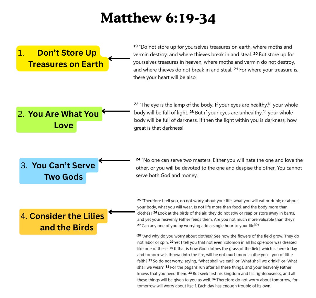 Firstly, Jesus says that we shouldn’t pile up treasures (attachments, idols, things we try to derive an ultimate sense of satisfaction from) on earth, because it will only attract trouble—along with anxiety about its eventual decay (i.e., “more money, more problems”). But if we aim toward heavenly treasures, we’ll never feel lack (i.e., “more heaven, less problems”? 10 USD to anyone who comes up with something catchier).