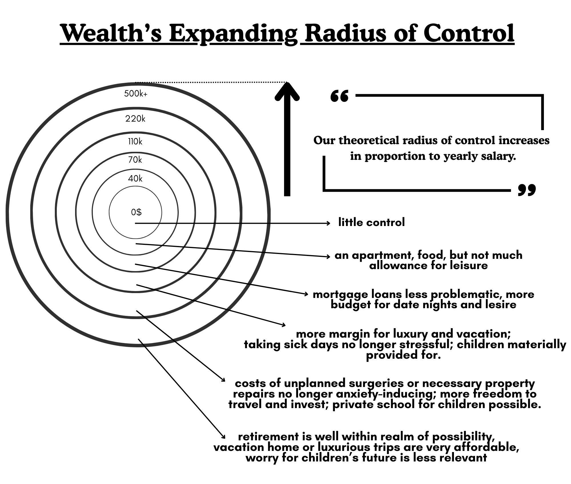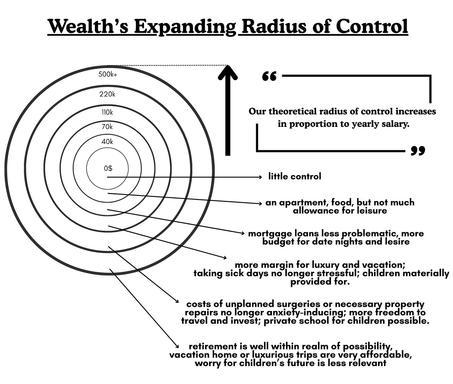 So when we talk about money, we’re not so much talking about the literal paper dollar bills or numbers in our bank account, but the radius of control those numbers afford.